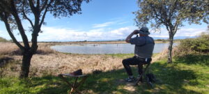 We rijden naar kijkhut 5 en zetten ons op ons stoeltje naast de kijkhut met zicht op een moeras met rietkraag. Mooie waarnemingen van Zwarte Ibis, koereigers, kleine zilverreiger, kleine plevier, oeverloper, steltkluut en purperreiger.