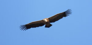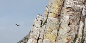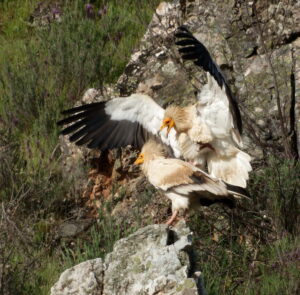 Het is kwestie van een paar uurtjes in de omgeving van de rots te blijven om te kunnen genieten van de wervelende vliegshows van de vale gieren.