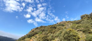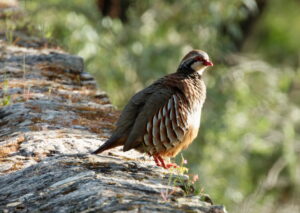 Bij een mirador – parking horen we een eigenaardig geratel. Het is een rode patrijs die op een muurtje ijverig aan het baltsen is.