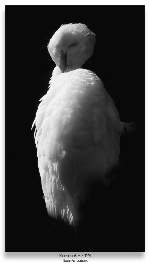 De vogel maakte een elegante draai met zijn nek, alsof hij zich een weg baande door een onzichtbare dans en ik kwam op het idee om hier later een kunstzinnig zwart-wit beeld van proberen te maken.