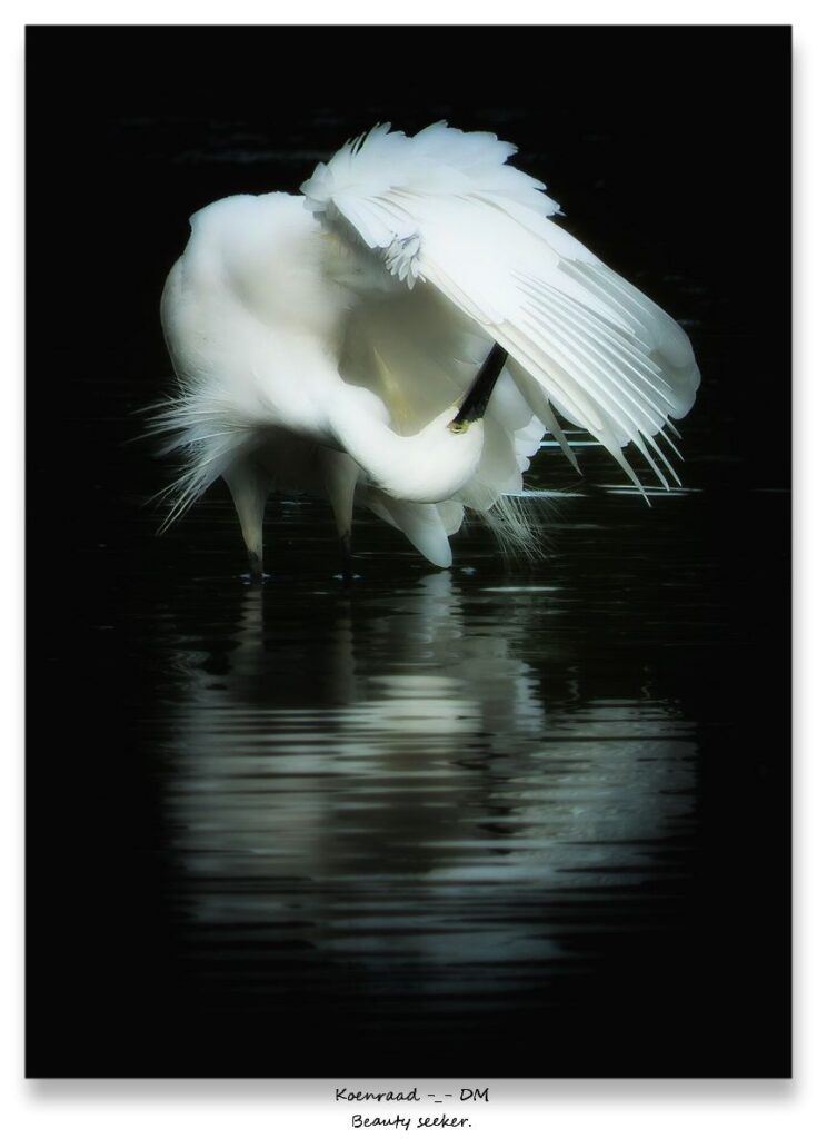 Met de aandacht en beheersing van een danseres boog ze haar lange hals omhoog. Geen gebaar was overhaast, elke beweging vloeide in de volgende over, geduldig, doelbewust en toch wonderlijk licht. Ze streek de uiteinden van haar vleugels na, alsof ze haar kostuum voor een voorstelling gladstreek. Met een elegante draai bereikte ze de verborgen plekken, waar geen toeschouwer ooit zou kijken, maar waar voor haar geen detail onbelangrijk was.