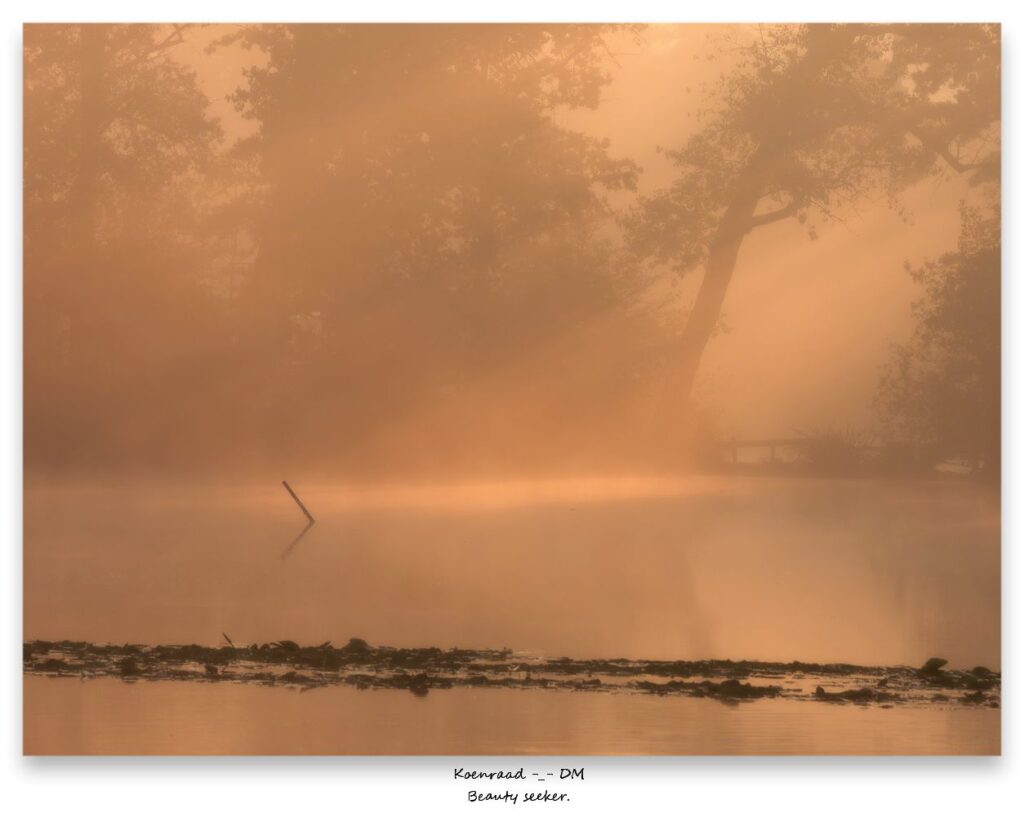 Tussen de nevelslierten hing een zachte stilte, alsof de wereld even haar adem inhield. Mijn gedachten dreven mee op dat stille ritme, mijmeringen die vervaagden in het licht van de opkomende zon.