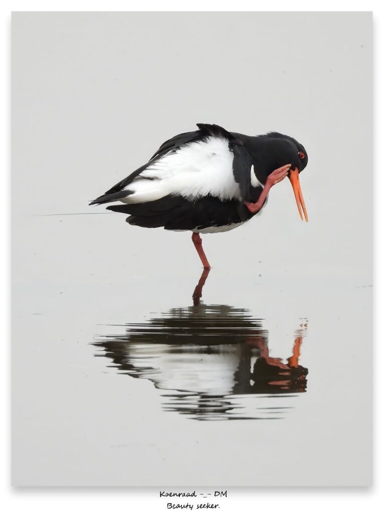 Aan de rand van den Donk stond een scholekster, rank en statig, rustend op één poot alsof hij wacht hield over het meer.